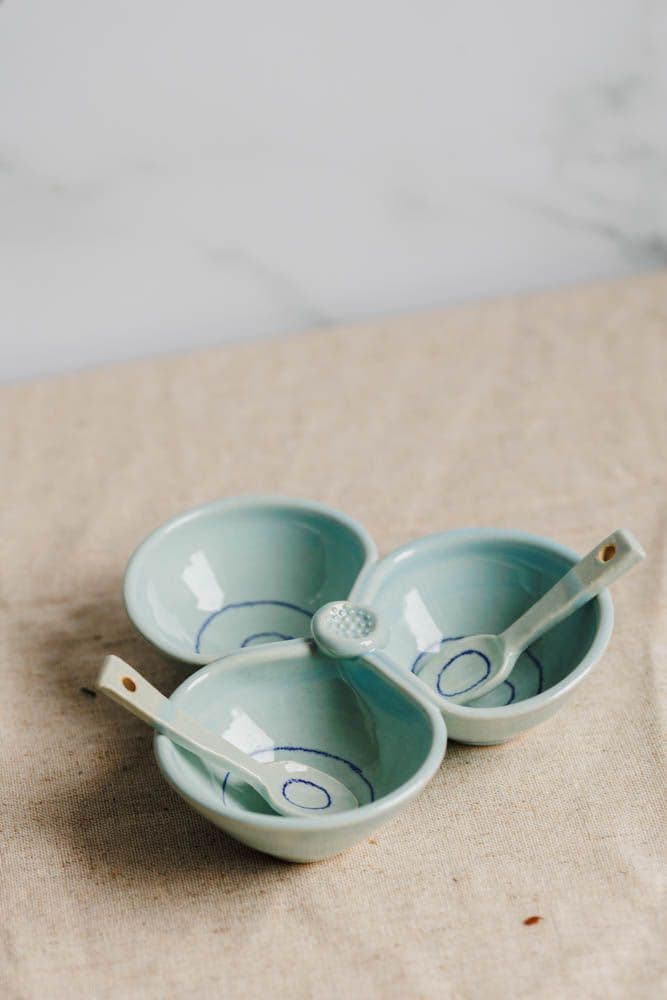 Alison Hanvey's range of quality hand thrown functional stoneware is timeless and sits well in both modern and more traditional homes. This small triple dip bowl is perfect for oil, vinegar or other condiments. They are dishwasher and microwave safe. Please note that spoons are available separately. As each dip bowl is handmade, the pattern, shape or size may vary slightly.