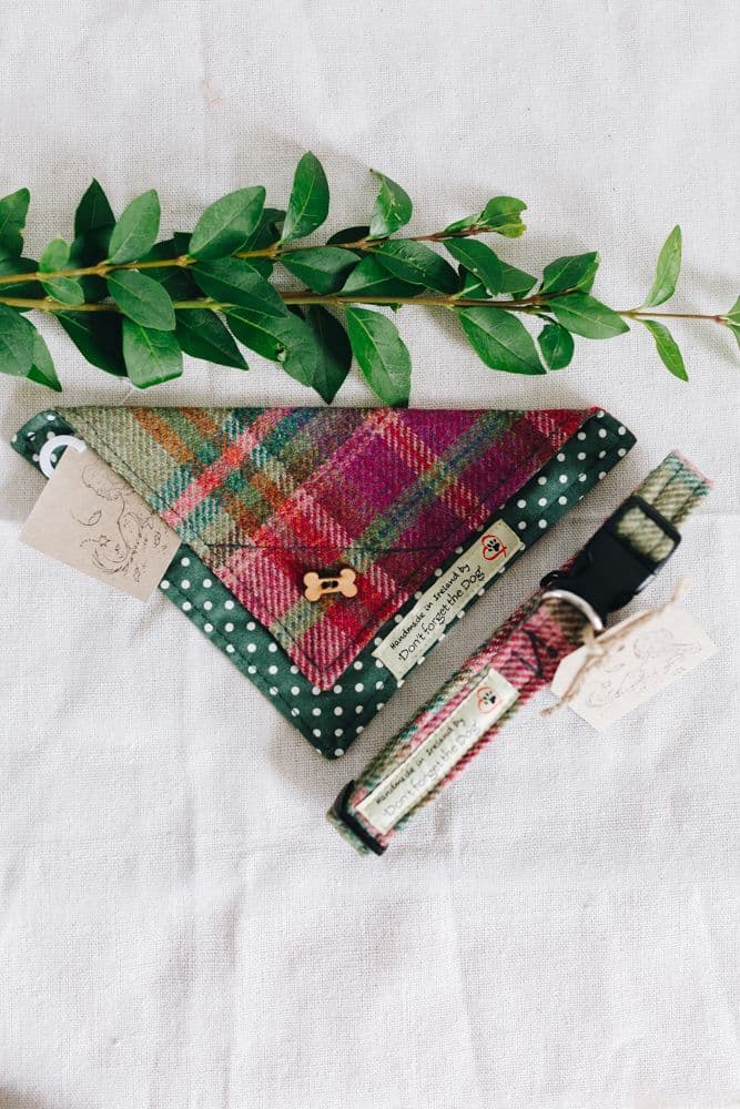 Don't Forget the Dog luxury dog accessories are all handmade and designed by Claire herself, with the colours and materials chosen to tie in with our rural landscape. Tweeds stand up well against the Irish weather and have a lovely traditional appearance. These wool neckerchiefs are non tie so they just sit on your dogs own collar through a stitched area at the top. A matching collar, lead and dicky bow is available here.