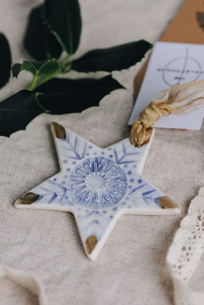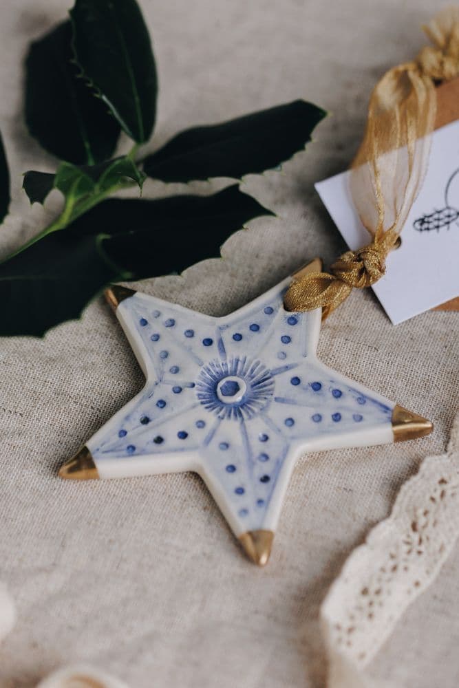 Based on a farm in rural Ballyclare, Helen Meuwissen crafts her unique ceramics from her art and craft studio space The Barley House. Her work has a distinctive style with delicate blue patterns and designs. These gold tipped star Christmas decorations by Helen Meuwissen are handmade and glazed in subtle tones of blue. A high gloss glaze gives each piece a beautiful shine. They are handmade in assorted patterns and designs so no two will be exactly alike.