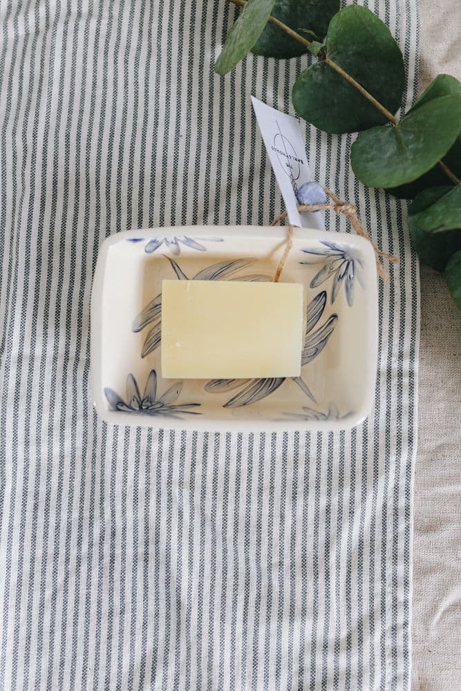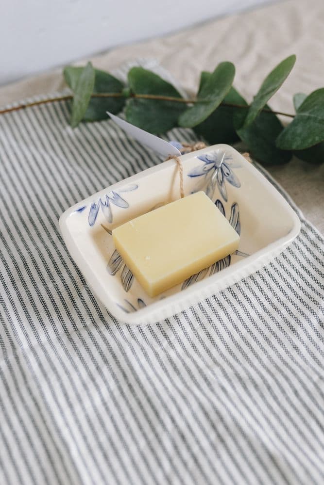 Based on a farm in rural Ballyclare, Helen Meuwissen crafts her unique ceramics from her art and craft studio space The Barley House. Her work has a distinctive style with delicate blue patterns and designs. This ceramic soap dish with dragonfly design by Helen Meuwissen is handmade and glazed in subtle blue hues so every one is unique. It comes with holes for draining. A high gloss glaze gives each piece a beautiful shine.
