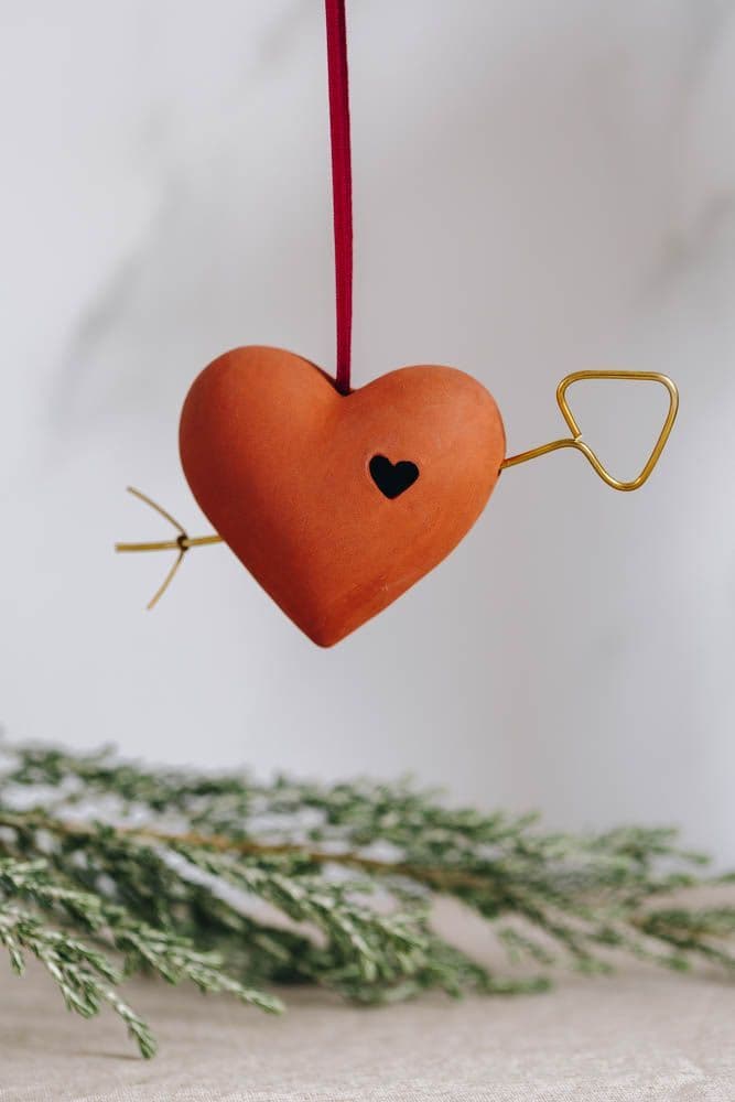 These handmade hanging terracotta hearts by Jemma Millen are struck with a golden arrow and finished with an olive green satin ribbon. Each heart has been struck by an arrow of love, ready to give to a loved one to represent your love for them. The surface of the heart is matte and unglazed and shows off the beautiful earthy red aesthetic of the earthenware clay. 20% of profits from the sale of these Hearts are in aid of NI Chest Heart & Stroke Charity. Presented in a gift box, they make a perfect gift.