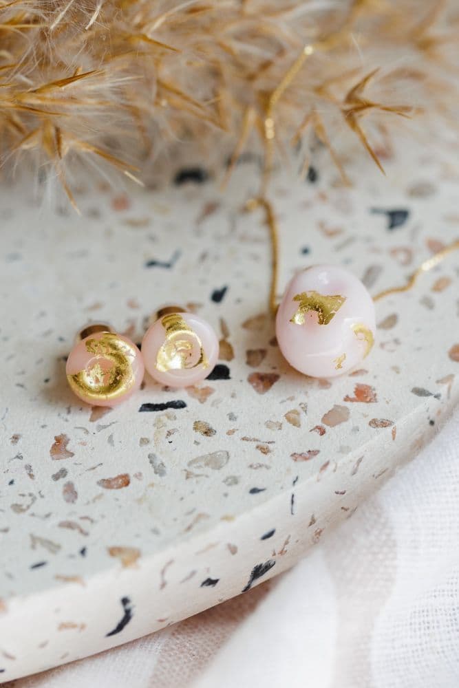 Through exploring her love of pattern, form and colour, Margaret Napier creates exciting contemporary handmade glass jewellery at Glass i Studio in Banbridge. These baby pink fragment stud earrings are made from a dimpled opaque glass fragment and finished with light-catching 24k gold leaf. They are both elegant and remarkably tactile and come complete with a gift box. You can view all of Margaret Napier's handmade glass jewellery including a matching pendant here.