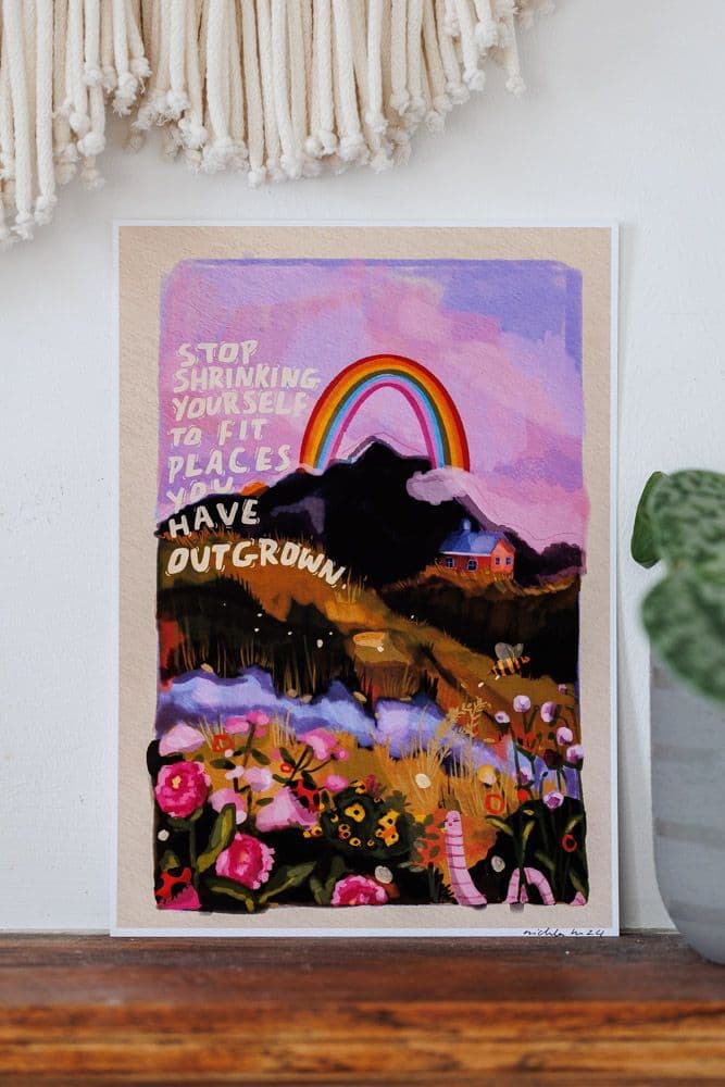 Nichola Irvine is a freelance Illustrator, artist and teacher based in Belfast. Her work focuses on landscapes around Ireland often paired with inspiring quotes to create art that is uplifting. This open edition print of her original illustration features the quotation "Stop shrinking yourself to fit places you have outgrown". You can view all original artwork and prints by Nichola Irvine here.