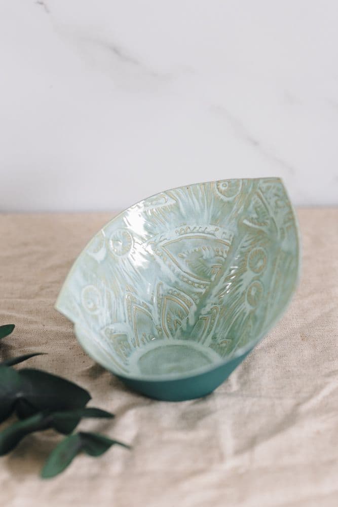 This beautiful decorative hosta bowl by Ruth Fairhead is hand built from slabs of clay and then imprinted with patterns using linocut. Designing her own patterns and cutting her own lino is an important part of Ruth's design process. Ruth uses glazes that enhance the ridges and troughs of the imprinted clay and this colourway is aptly named 'Aqua'.