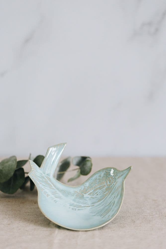 This beautiful wren dish by Ruth Fairhead is hand built from slabs of clay and then imprinted with patterns using linocut. Designing her own patterns and cutting her own lino is an important part of Ruth's design process. Ruth uses glazes that enhance the ridges and troughs of the imprinted clay and this colourway is aptly named 'Aqua'.