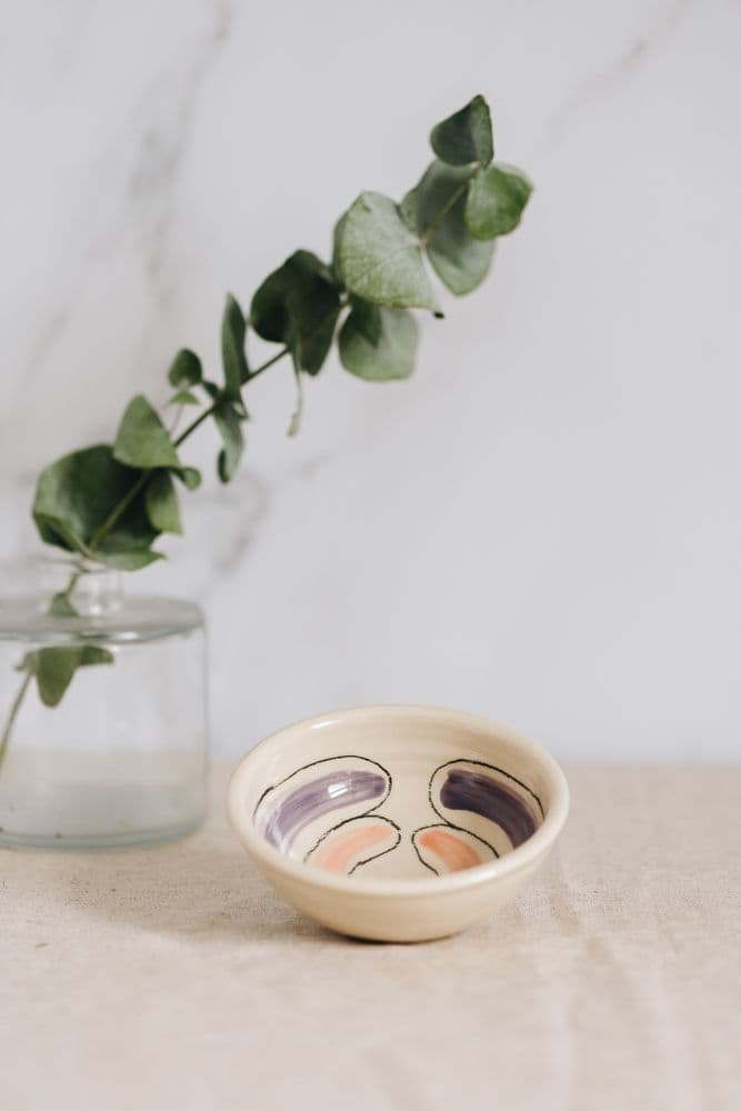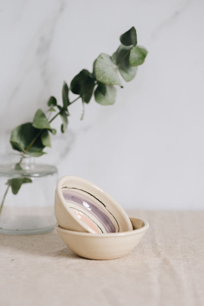 These handmade ceramic dip bowls are adorned with a banded lilac & pink design. They are dishwasher and microwave safe. As each dish is handmade, the glaze, shape or size may vary slightly.