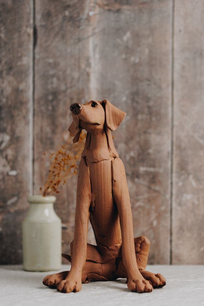 This one of a kind sculpture of a sitting tan dog has been hand sculpted by Virginia-Dowe Edwards in her Warwickshire studio. Virginia has always loved dogs, ever since growing up along side 'Tolly', a gorgeous Labrador cross Irish Setter who was more like a brother to her than a dog. She has realised her childhood ambition to sculpt peoples’ pets and has mastered the art of capturing subtle expressions and playful poses.
